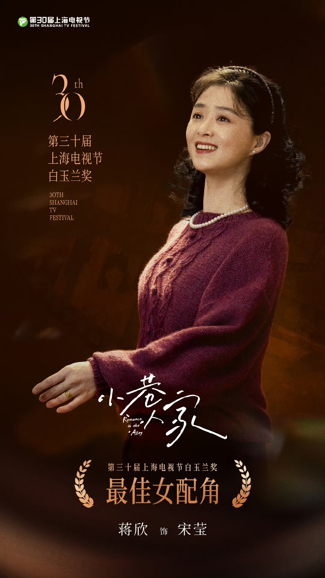 蒋欣凭借年代剧《小巷人家》夺得本届白玉兰奖最佳女配角奖,这也是她首次获得白玉兰奖的演员奖项。发表获奖感言时,蒋欣感谢了闫妮、李光洁、郭晓东等剧中搭档,以及剧组全体同仁,“有大家的付出才有我在此绽放的机会”。蒋欣表示,自己会怀着这份热情,继续努力做一名好演员。