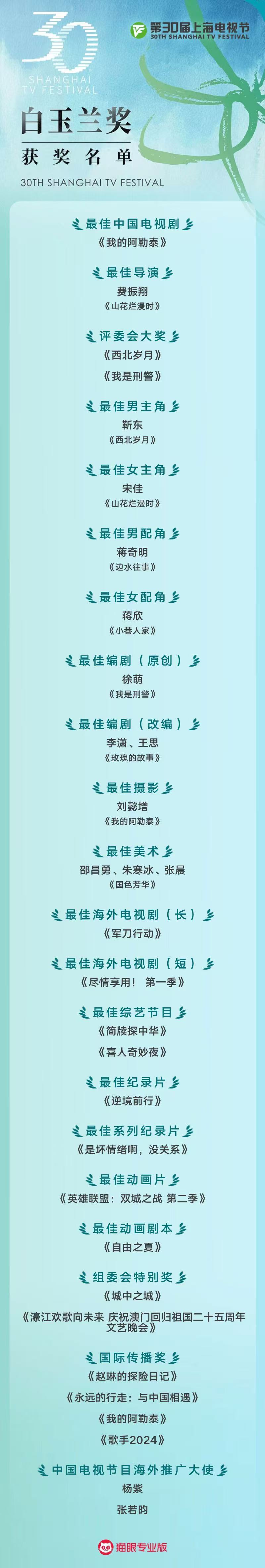本届白玉兰奖完整获奖名单如下: