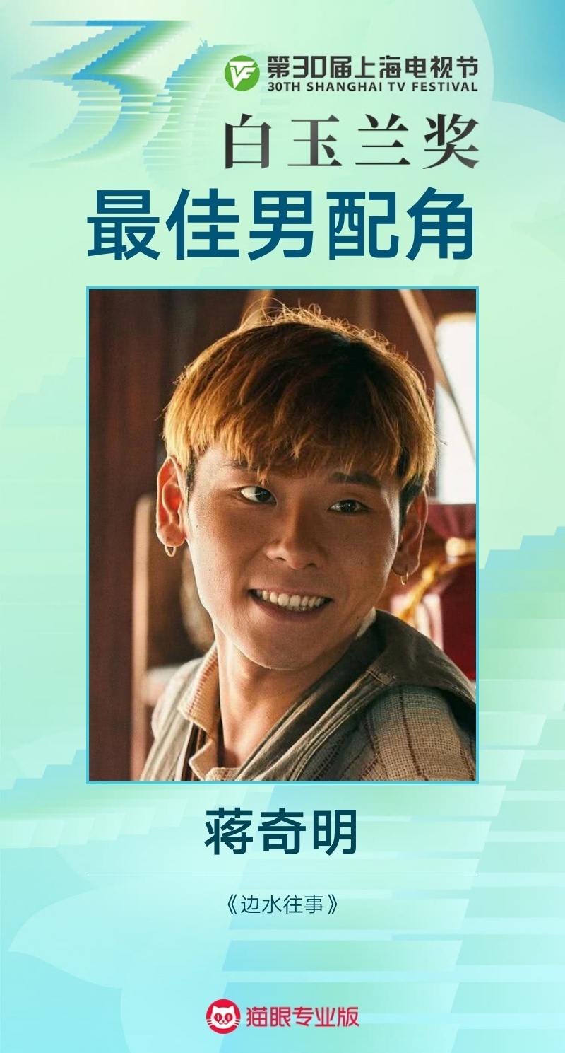 蒋奇明凭借《边水往事》中的“王安全”一角击败富大龙、郭晓东、林更新、聂远等前辈,夺得本届白玉兰奖最佳男配角奖。他也是本届最佳男配角提名者中最年轻的一位。在《边水往事》中,蒋奇明饰演的王安全是一个一生未得安全,颠沛流离的可怜人,一句 “我叫王安全,找我最安全”也成为他在剧中的名台词。
