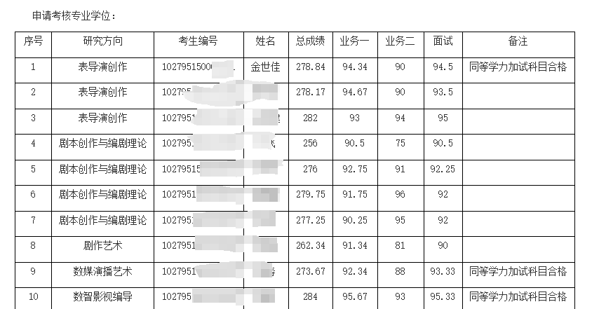 上海戏剧学院官方发布的名单显示,“金世佳”报考的是表导演创作专业学位,业务一科目成绩为94.34分,黄晓明报考的是艺术管理/戏剧策划的专业学位,业务一科目成绩为89分。