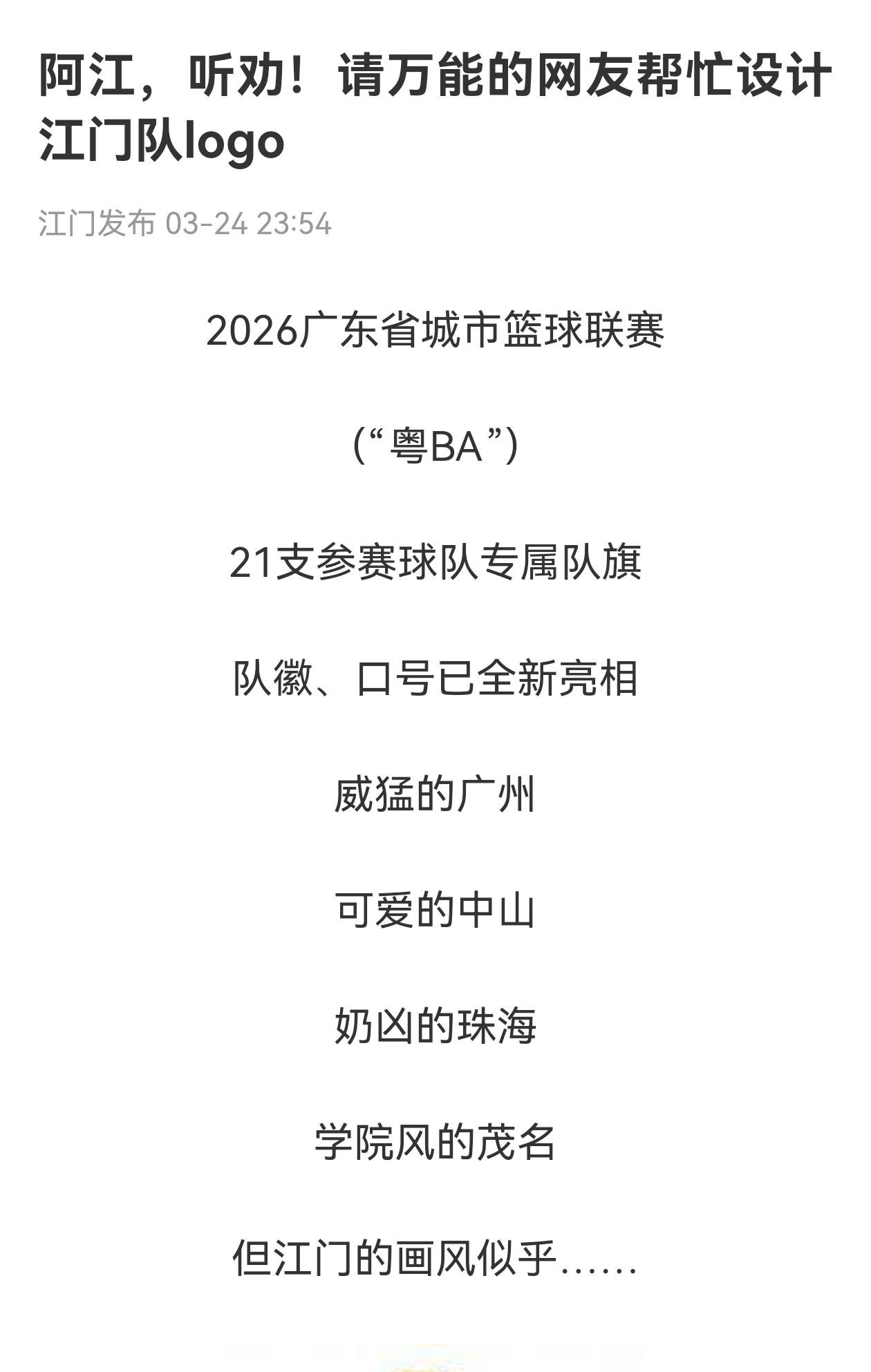 粤BA各参赛队队徽一亮相,便引来网友热议。威猛的广州、可爱的中山、奶凶的珠海……各具特色的设计让人眼前一亮。然而,江门队的队徽却因为“画风清奇”意外出圈——简单、不合逻辑,甚至被调侃“球比篮筐大怎么进球”。听到网友毫不留情的吐槽,江门在一天之内、于3月24日晚发布《阿江,听劝!请万能的网友帮忙设计江门队logo》的文章回应,态度诚恳、语气幽默,公开向全网征集新队徽。