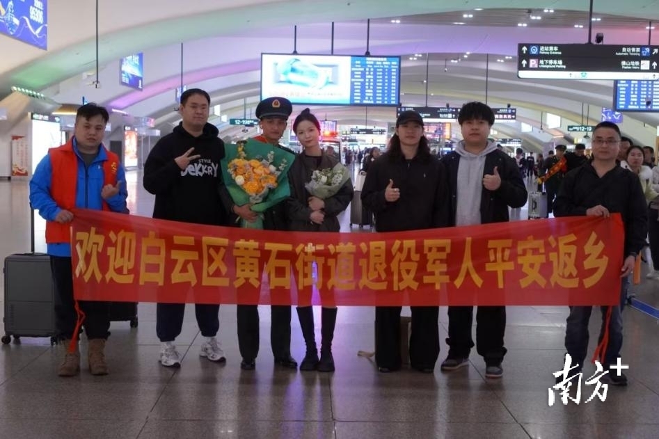 与此同时,各镇街退役军人服务站也纷纷行动。黄石街道退役军人服务站组织工作人员与红棉老兵志愿者一同前往广州南站等交通枢纽,迎接从远方归来的退役士兵。当身着戎装的退役士兵走出站口,迎接队伍立即上前,为退役士兵送上鲜花,现场响起热烈掌声。红棉老兵志愿者与退役士兵亲切交流,分享自身经历,传递“老兵迎老兵”的深厚情谊,让退役士兵在踏出车厢的第一时间就感受到家乡人民的热情与尊崇。