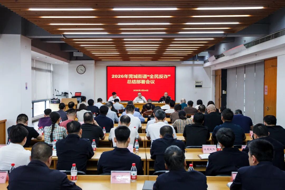 为切实守护人民群众财产安全,3月24日,莞城街道召开2026年“全民反诈”总结部署会议,总结去年街道“全民反诈”工作情况,并对下阶段重点工作进行安排部署。莞城街道党工委副书记叶俊杰,办事处副主任、公安分局局长刘焯参加会议。
