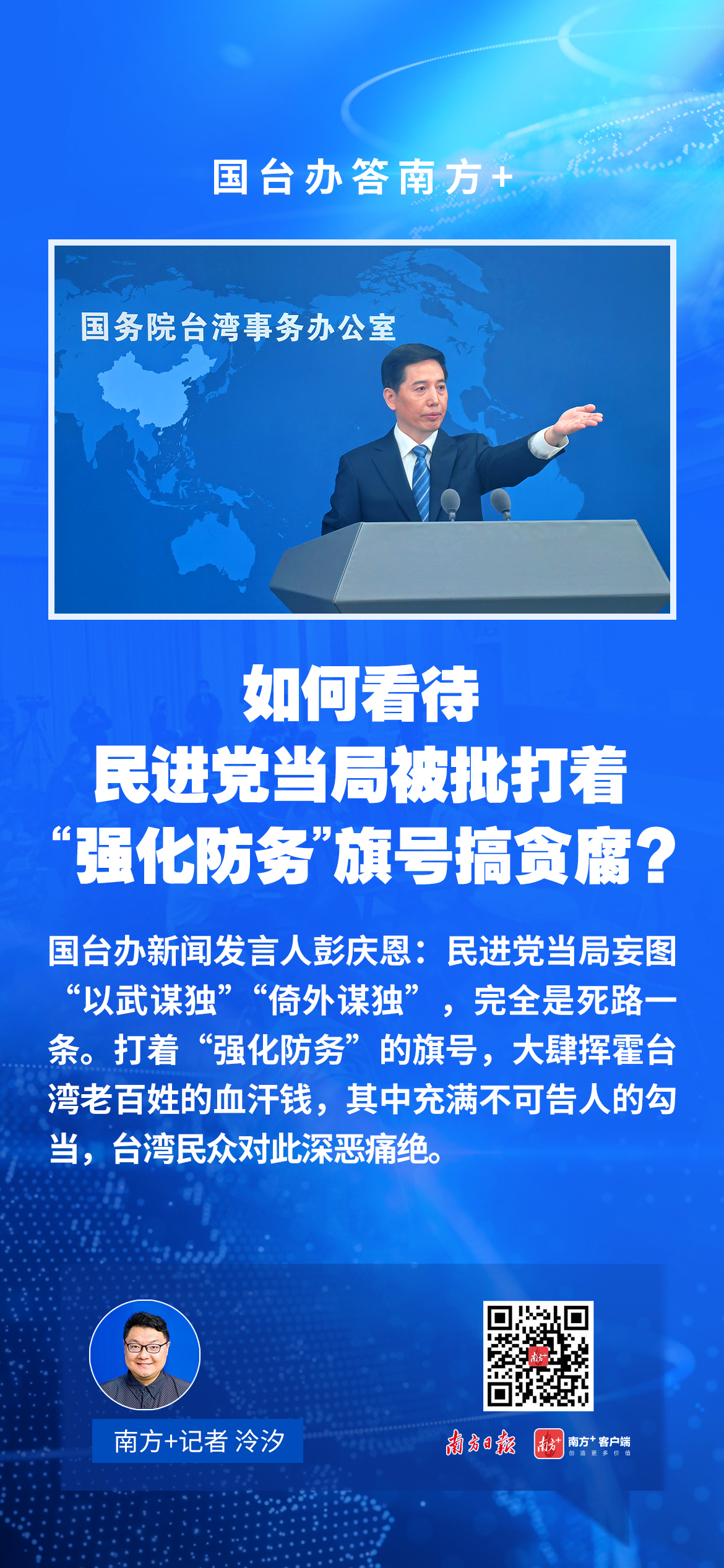 会上南方+记者提问:台防务部门负责人日前承认,向美采购的F-16战机如期交货及台军自造潜艇完成交付都很困难。岛内有舆论指出,台防务部门高额预算注水严重,有官员表示“几张纸就能骗好几亿”。民进党当局所谓的“强化防务”已成为“挂羊头卖狗肉”的贪腐。对此有何评论?