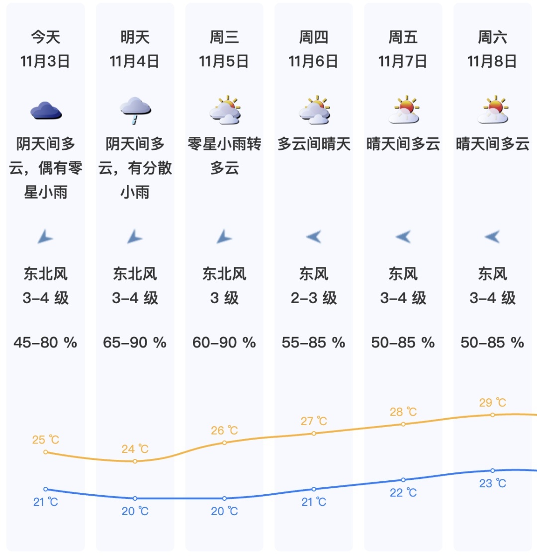 周一阴天间多云,偶有零星小雨,东北风沿海、高地和海区最大阵风6-7级,气温21-25℃。