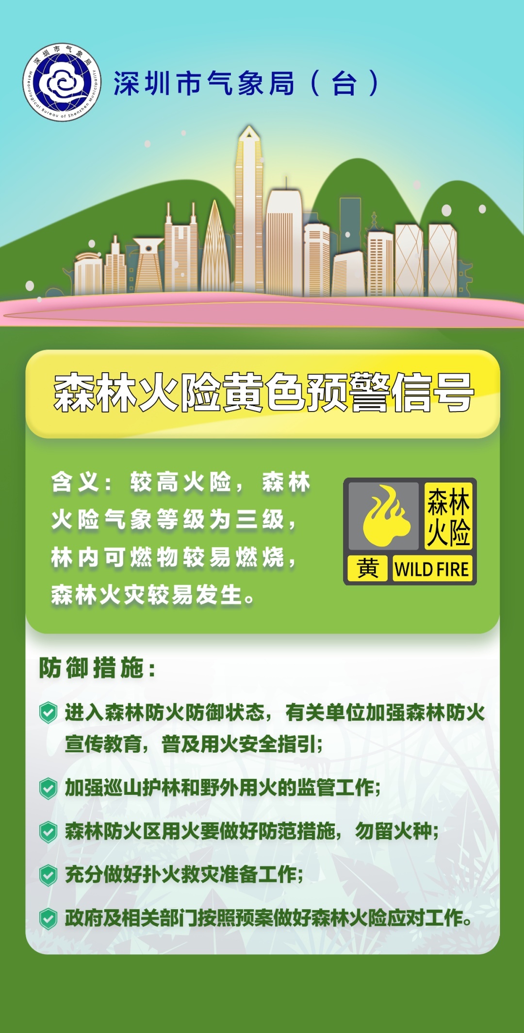 天气持续干燥,全市森林火险黄色预警信号生效中,请市民注意森林防火和居家用火用电安全,户外活动时注意及时补充水分。