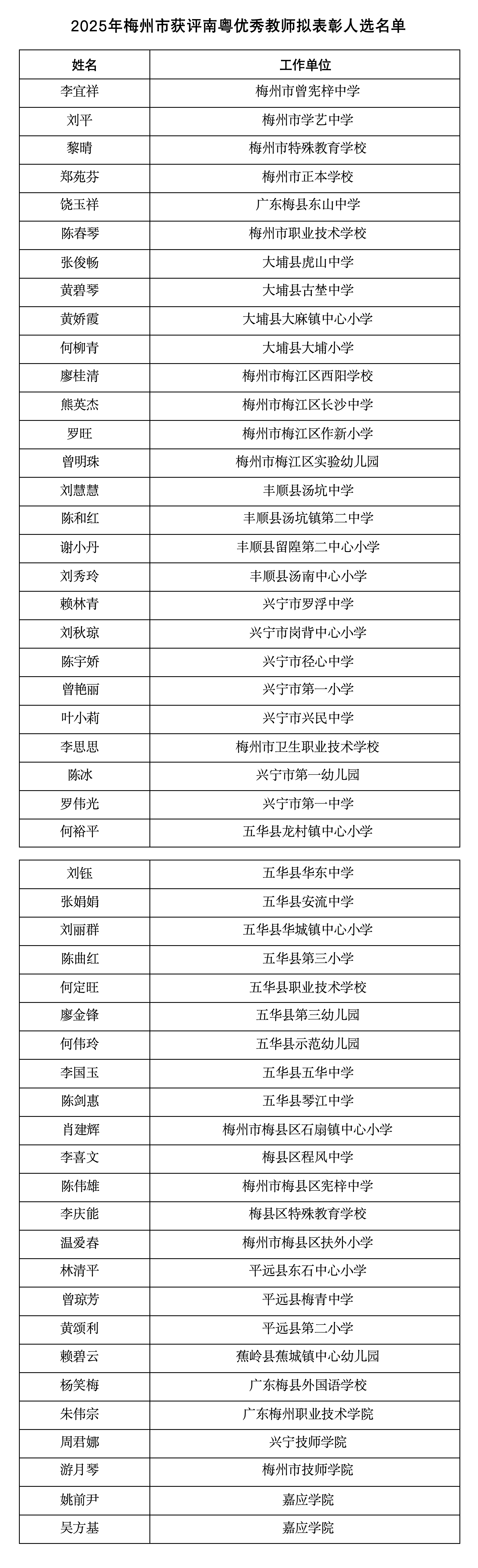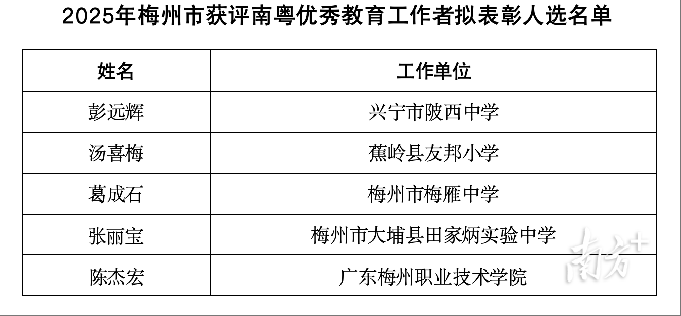 日前,为庆祝第41个教师节,展现广东教师队伍时代风采,广东开展2025年南粤优秀教师、南粤优秀教育工作者和特级教师评选活动,选树宣传先进典型。活动开展以来,各地各单位积极推荐,经严格评审、多层公示,最终评选出南粤优秀教师1675名、南粤优秀教育工作者170名、特级教师499名,共计2344人获得表彰。其中梅州市共有51人获评南粤优秀教师,5人获评南粤优秀教育工作者,25人获评特级教师。