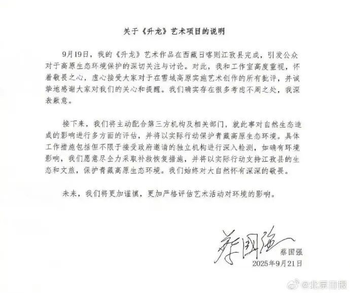 蔡国强工作室官微发布关于《升龙》艺术项目的说明称,“虚心接受大家对于在雪域高原实施艺术创作的所有批评,并诚挚地感谢大家对我们的关心和提醒。我们确实存在很多考虑不周之处,我深表歉意。”