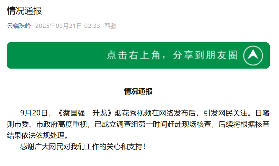 9月21日凌晨,西藏“云端珠峰”微信公众号发布情况通报,9月20日,《蔡国强:升龙》烟花秀视频在网络发布后,引发网民关注。日喀则市委、市政府高度重视,已成立调查组第一时间赶赴现场核查,后续将根据核查结果依法依规处理。