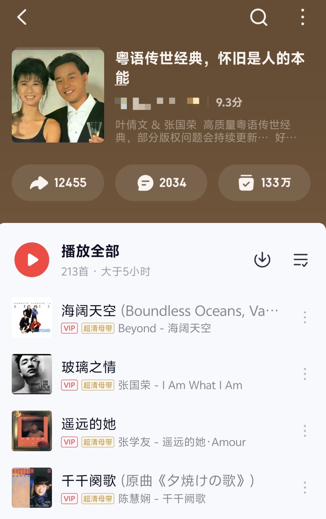 从前听的粤语歌手从四大天王到陈奕迅、卫兰等,首首都是精华;而现在能打的新生代粤语歌手,被现在年轻人熟知的也就周柏豪、MC张天赋等,但是实际上,年轻人的歌单里面听的永远还是那些粤语经典老歌。
