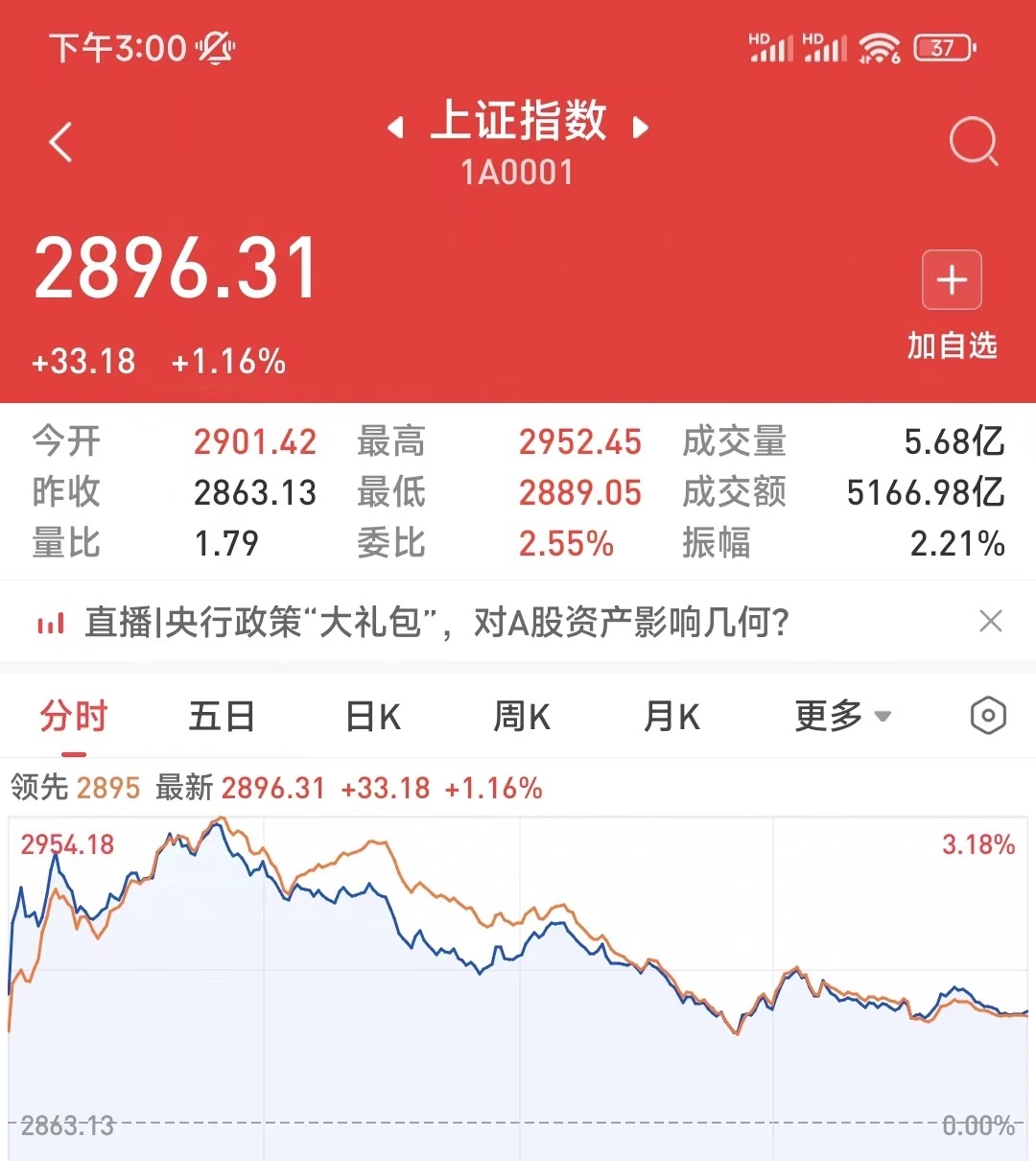 受24日国新办发布的金融政策“组合拳”的利好提振,9月24日A股全线大涨,两市近5000只股票飘红。