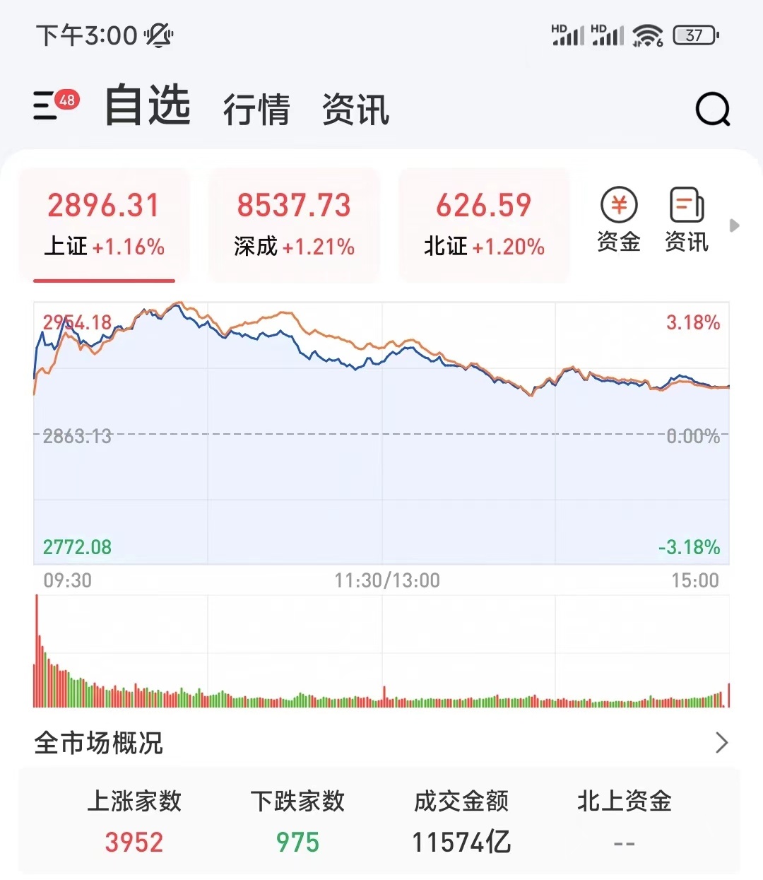 9月25日,A股延续前一日放量态势,三大指数收涨。不过,全天呈现高开后震荡回落的态势。沪指盘中一度拉升至2952点,收盘回落至2896.31点,涨1.16%;深成指涨1.21%;创业板指涨1.62%。