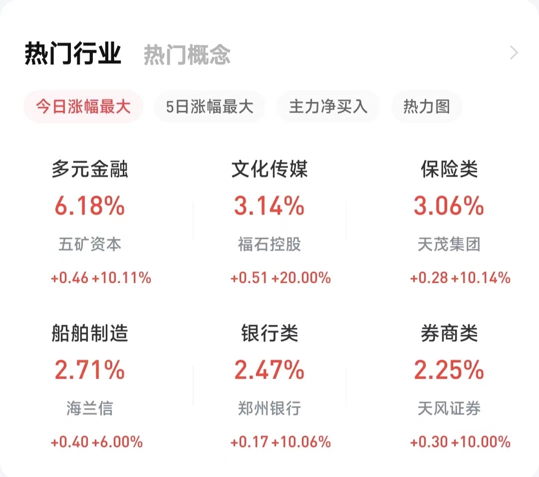 板块方面,仍然是多元金融板块保持领涨,五矿资本、南华期货、爱建集团等多只股票二连板。保险类、银行类、券商类的涨幅也超过2%,天茂集团、郑州银行等涨停,国海证券、天风证券二连板。文化传媒板块涨幅较大,电广传媒、华闻集团等多股涨停。