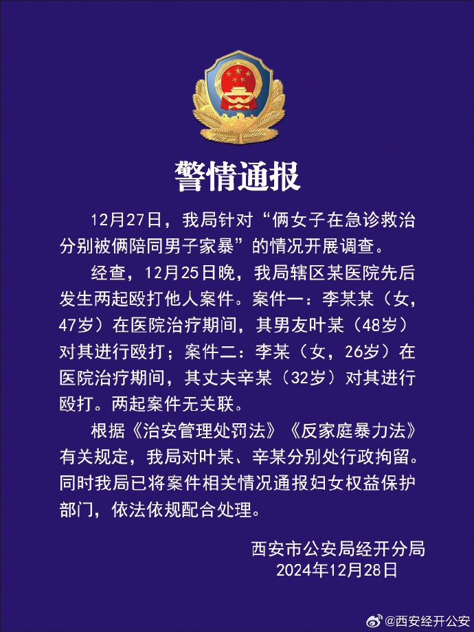据报道,2024年12月25日晚23时许,陕西省西安市长安医院急诊科发生了一起家暴事件。两名女患者在救治过程中遭到陪同家属的殴打。目击者透露,尽管现场有保安人员,但未能有效制止暴行。12月28日,西安经开公安发布通报,内容如下: 编辑 李静娴 订阅后可查看全文(剩余80%)