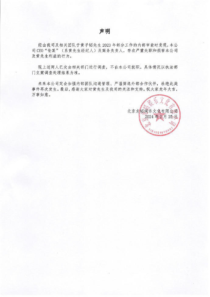2月25日,黄子韬公司@龙韬娱乐 发布声明,称CEO(原黄子韬经纪人)和商务负责人严重失职,现已交由相关部门调查。全文如下。