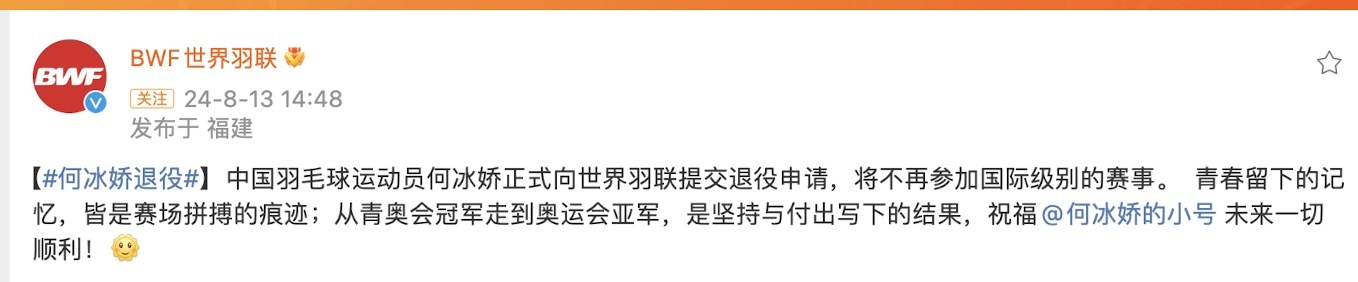 8月13日,世界羽联官方宣布,中国羽毛球运动员何冰娇正式向世界羽联提交退役申请,将不再参加国际级别的赛事。