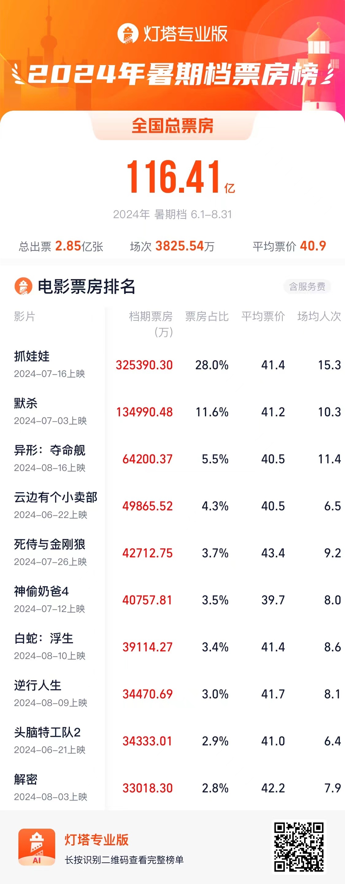今年暑期档共吸引2.85亿观众走进影院观影,超3800万场的场次较去年同比增长10%,创历史暑期档同期新高,同时平均票价41.0元保持稳定,与去年同期基本持平。
