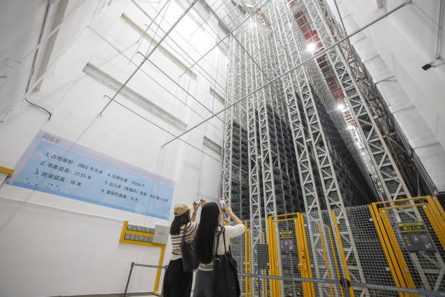 自动堆垛机穿梭在钢架之间,最高速度可达180公里/小时,时速超过绿皮火车!
