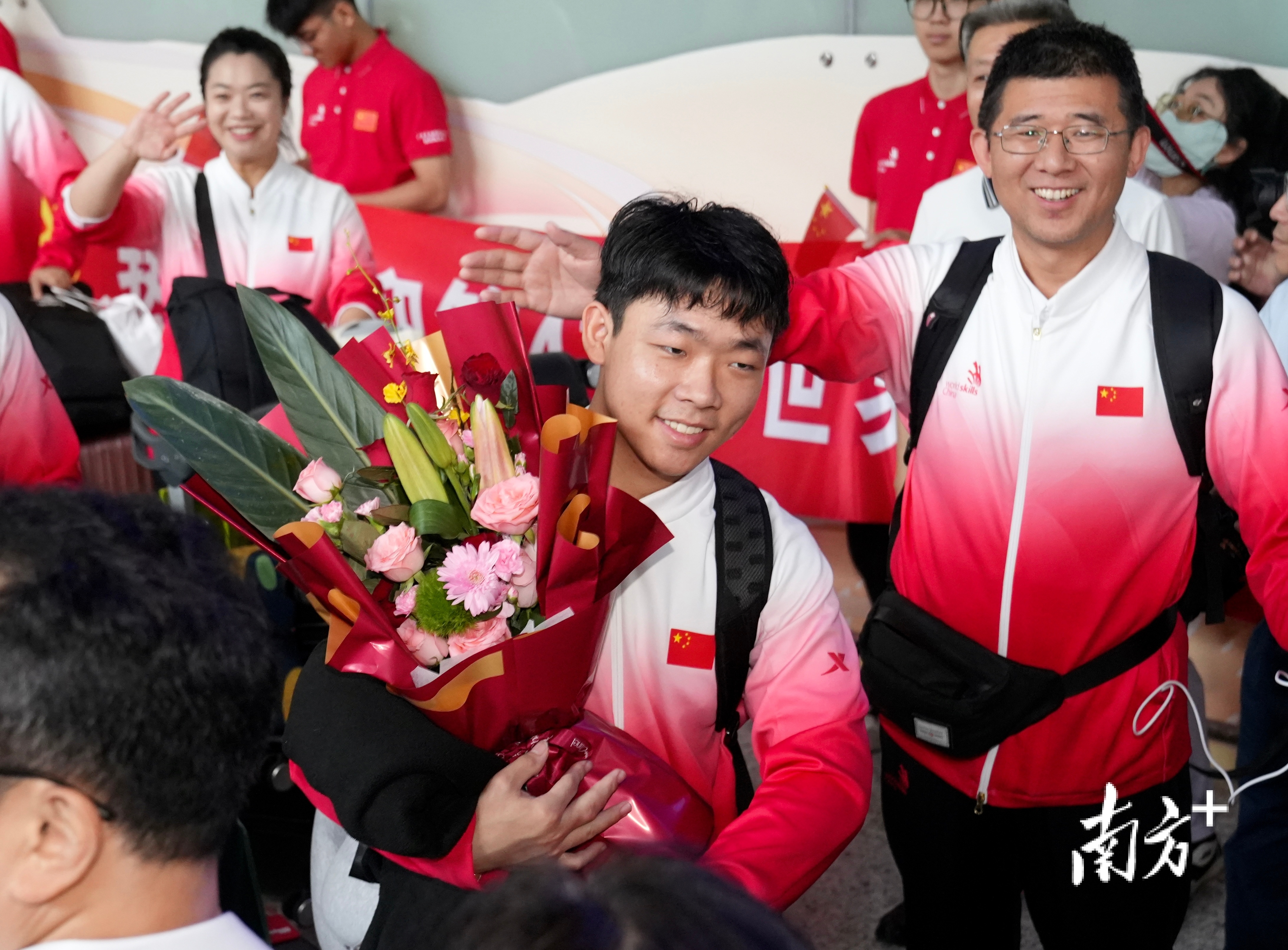 接机现场,来自数控铣项目团队的新老选手拥抱庆祝。作为“五连冠”的亲历者,全国人大代表、广东省机械技师学院教师杨登辉说,这个项目取得的佳绩,证明了我们国家的高技能人才培养水平已经进入世界顶尖行列,接下来要总结好经验,努力做好世赛成果转化,培养更多服务保障“制造业当家”的技能人才。