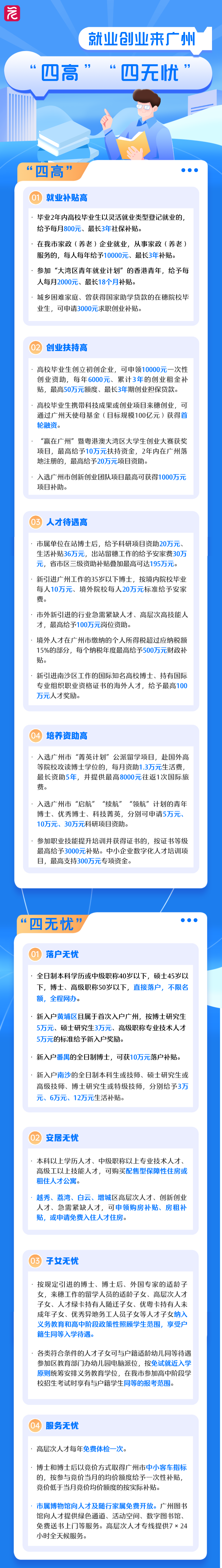 为了引才,广州人社部门今年计划全年举办各类招聘会超1000场,组织“十城百校千企”赴省外高校招聘会超30场,还“备好”了系列政策举措,人才来穗就业创业可享“四高”“四无忧”政策待遇,为人才营造良好的发展环境。
