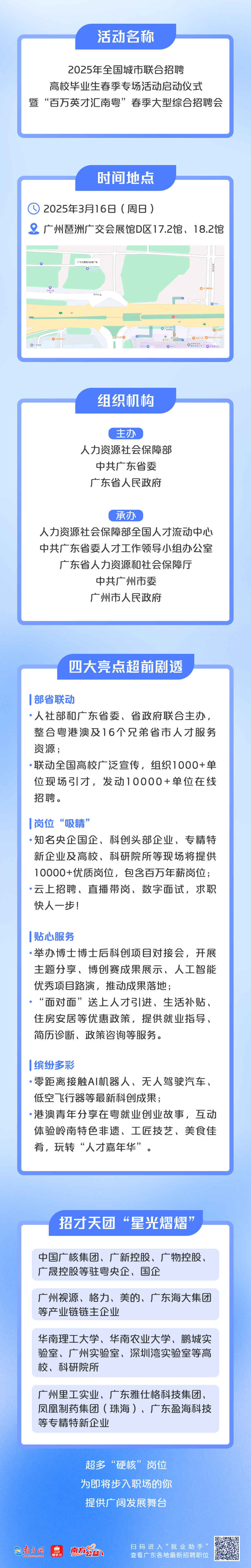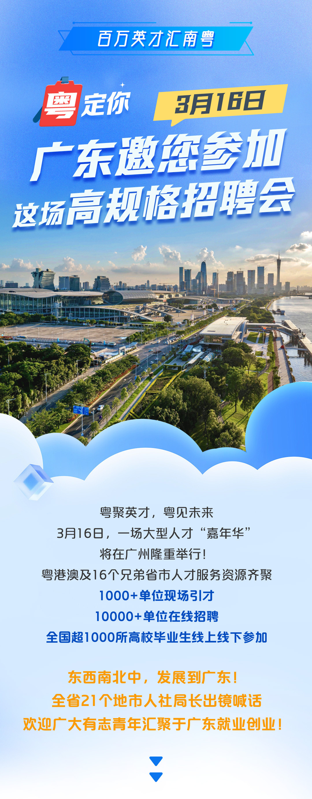 3月16日,“百万英才汇南粤”春季大型综合招聘会将在琶洲举行,届时将有一大批知名央企国企、科创头部企业、专精特新企业及高校、科研院所等现场将提供10000+优质岗位,包括数科集团、小鹏汽车、亿航智能、广州实验室、鹏城实验室、国家超算深圳中心、广电运通、广东电力、格力、美的、小马智行等都将到场释放超多高质量岗位。