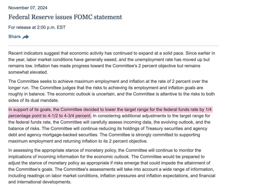 当地时间11月7日,美国联邦储备委员会宣布,将联邦基金利率目标区间下调25个基点,降至4.5%至4.75%之间的水平。