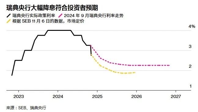 同日晚上,瑞典央行将基准利率降至2.75%,并表示可能在12月和2025年上半年进一步下调。这是瑞典央行十年来首次将利率下调50个基点,以加速对停滞经济的支持,并承诺未来将采取更多措施。