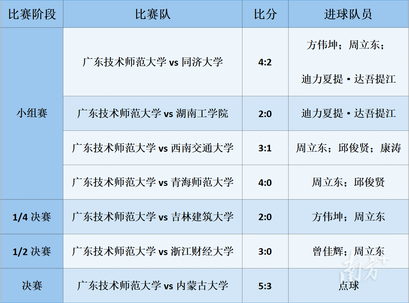 在本次联赛中,广师大一路过关斩将,从小组赛到淘汰赛再到决赛,7战全胜,进18球失3球,展现出了强大实力。
