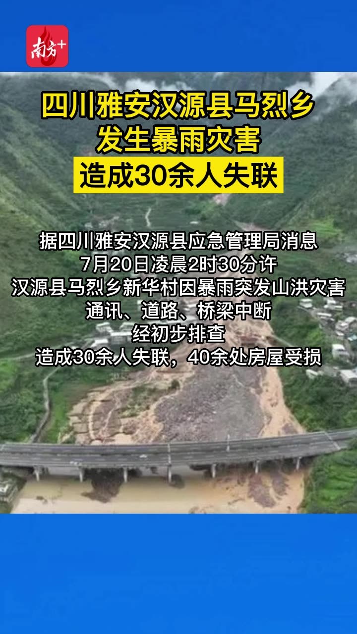 据四川雅安汉源县应急管理局消息,2024年7月20日凌晨2时30分许,汉源县马烈乡新华村因暴雨突发山洪灾害,通讯、道路、桥梁中断。经初步排查,造成30余人失联,40余处房屋受损。