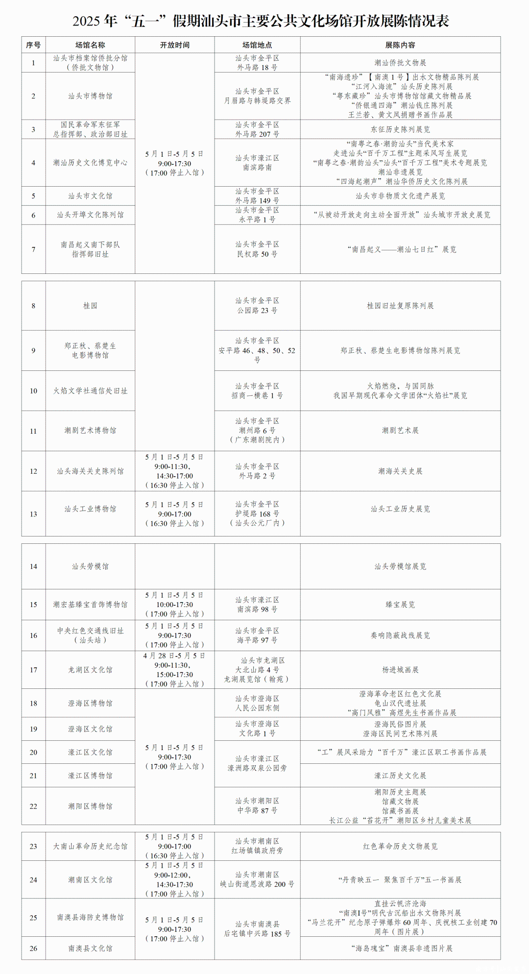 “五一”期间汕头市公共文化场馆