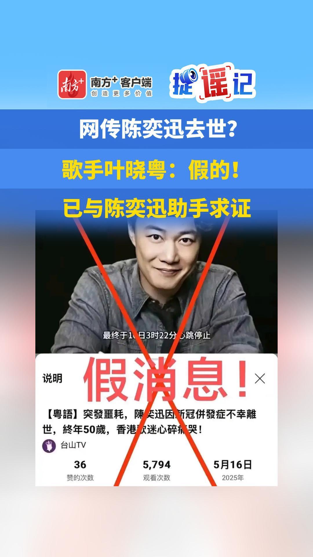 网传陈奕迅去世? 歌手叶晓粤:假的!已与陈奕迅助手求证