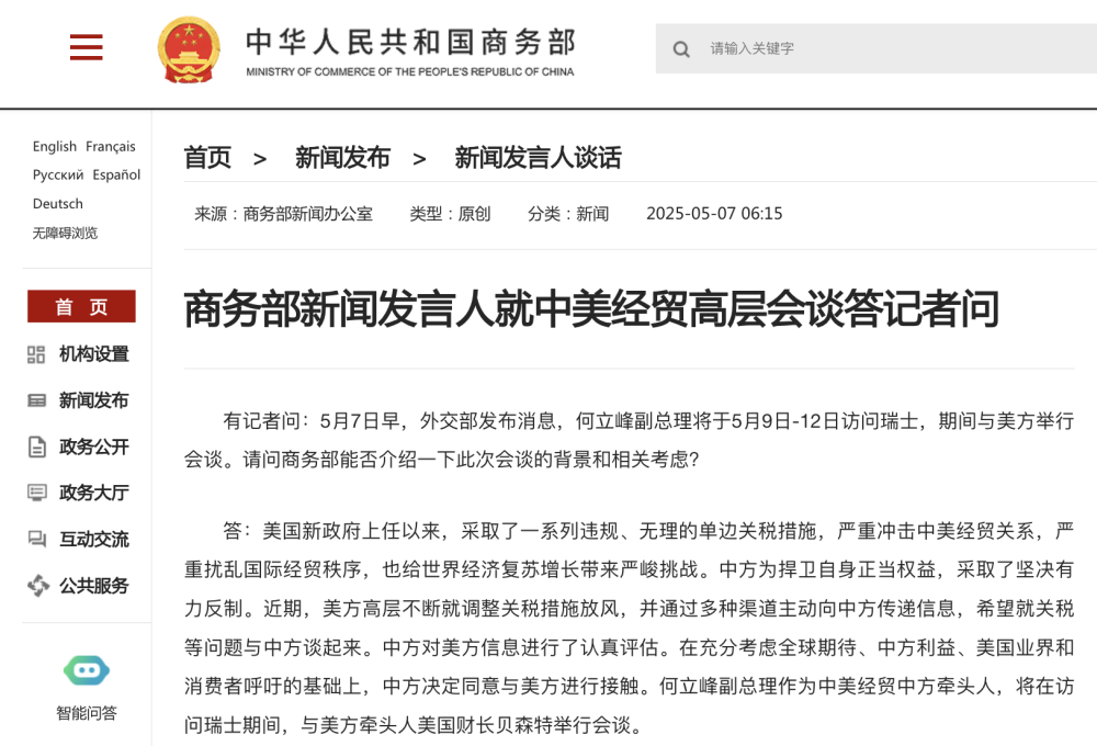 有记者问:5月7日早,外交部发布消息,何立峰副总理将于5月9日-12日访问瑞士,期间与美方举行会谈。请问商务部能否介绍一下此次会谈的背景和相关考虑?