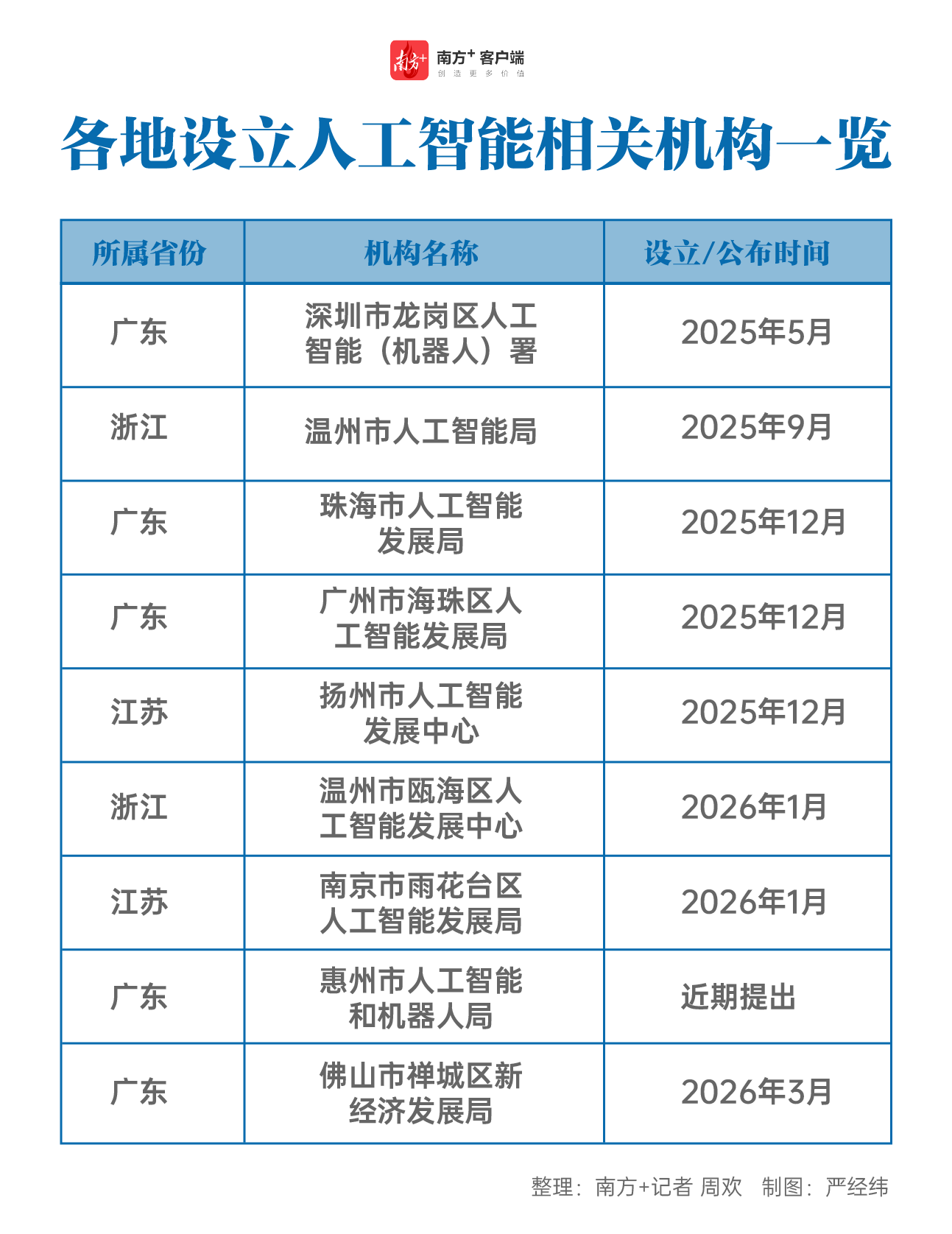 深圳试水,全国各地竞相入局。如今,温州市、珠海市、广州市海珠区、扬州市、南京市雨花台区等地已相继成立了人工智能发展局(中心)。