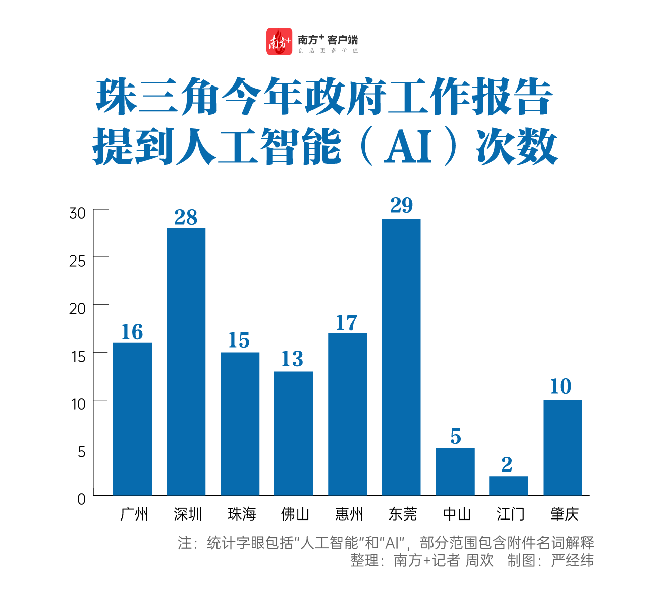 而那些没有设立专门机构的珠三角城市,也无一不把人工智能摆在前所未有的重要位置,并几乎都作为各地政府工作报告的高频词。