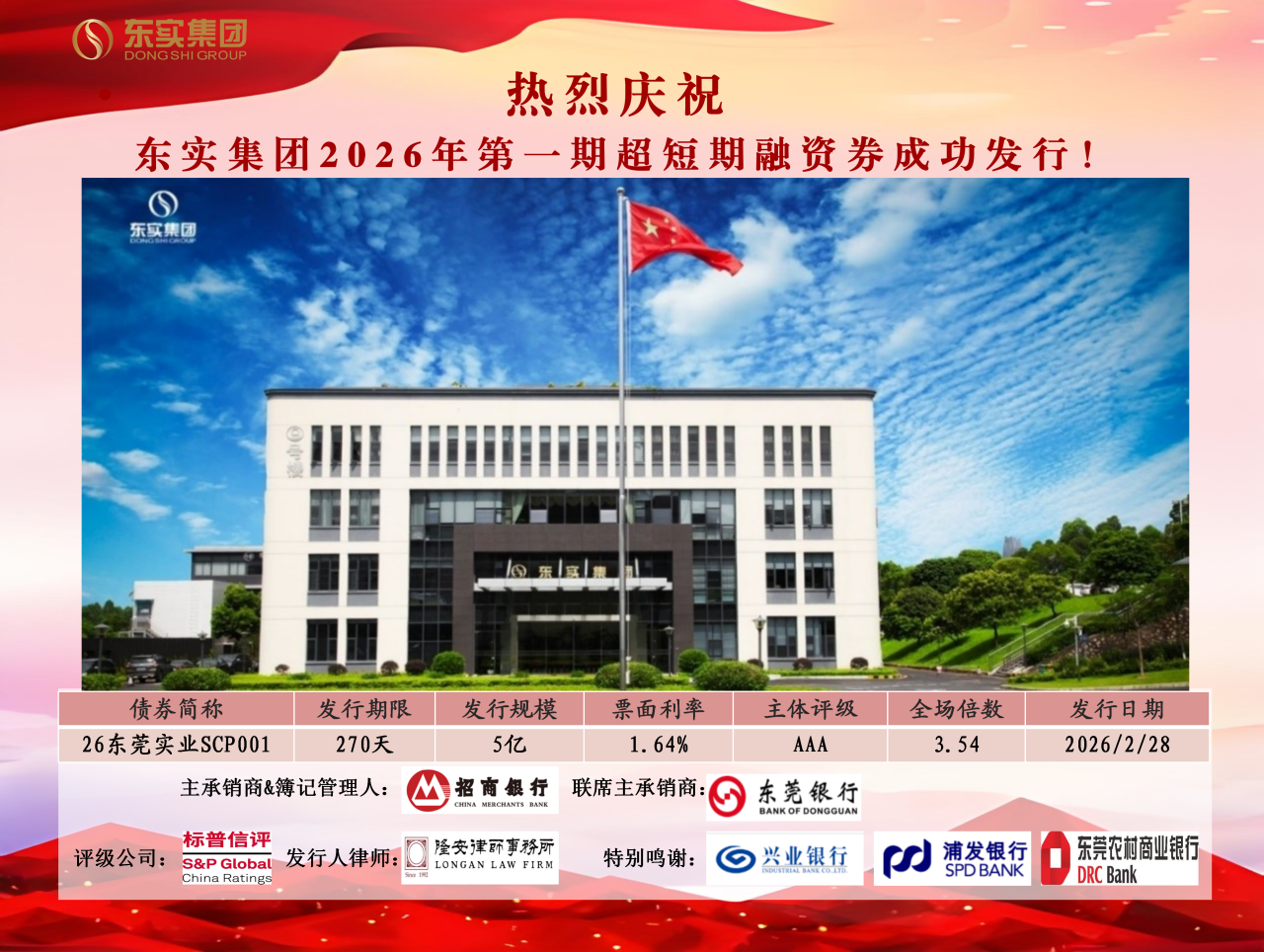 在“十五五”开局之际,东实集团主动把握融资窗口期,精准强化政策研判,积极探索债券融资新渠道,充分发挥AAA信用等级优势,高效推进超短期融资券发行落地。自2025年12月末,东实集团获得中国银行间市场交易商协会出具的15亿元超短期融资券注册通知书后,迅速启动发行工作,联合主承销商招商银行、联席主承销商东莞银行及各中介机构紧密协作,最终债券投资市场反响热烈,全场认购倍数高达3.54倍,发行利率创历史新低。