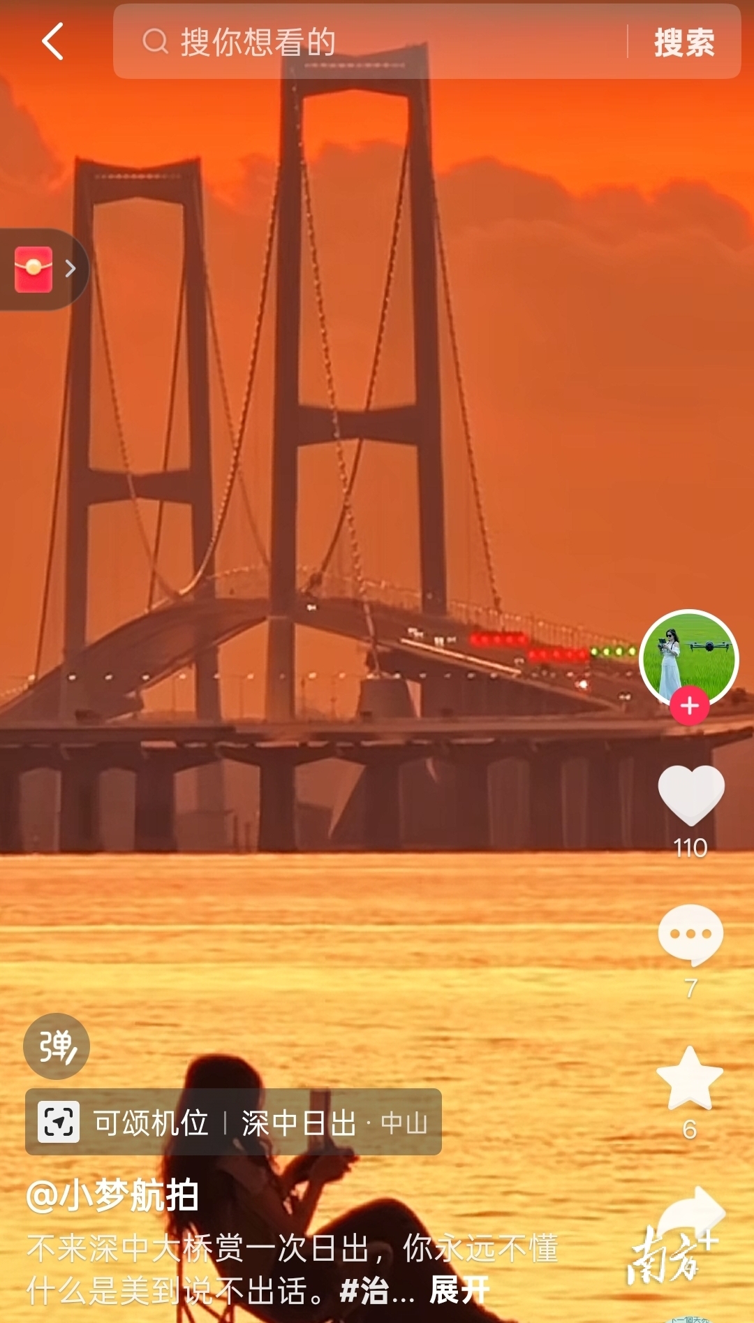 摄影博主小梦航拍分享的深中通道日出视频。