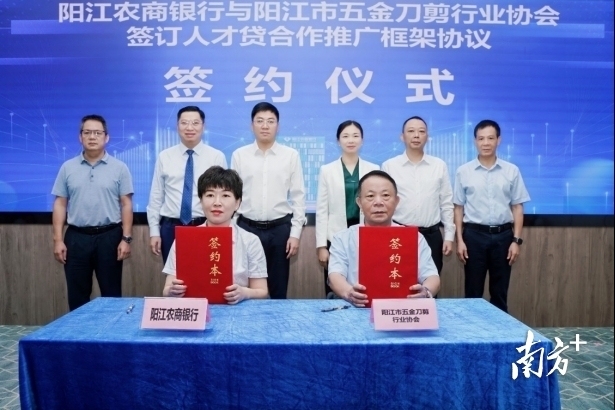 在与会领导嘉宾的共同见证下,阳江市五金刀剪行业协会与阳江农商银行现场签署了《“人才贷”合作推广框架协议》。随后,阳江农商银行为首批“阳江人才贷”授信对象颁发了“授信牌匾”,向合金材料与五金刀剪等重点产业人才代表合计授予1300万元意向授信额度,标志着“人才贷”产品正式落地见效。