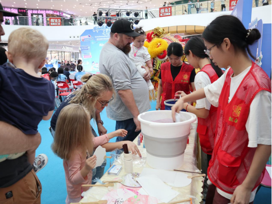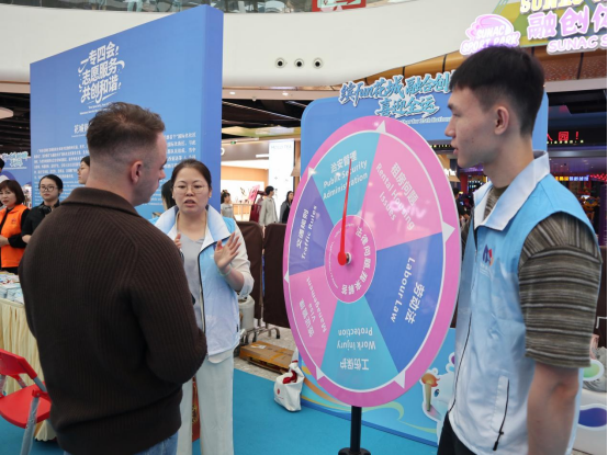 活动现场还特别设置了互动嘉年华区域,四大主题区各具特色,成为中外居民交流体验的热点。“奇妙融创文旅城之窗”以图文和实物带领观众秒穿世界级度假胜地,领略花城街独特的文旅魅力;“喜迎十五运”专区通过趣味问答传递体育精神,让全运知识变得生动有趣;“一专四会”服务区变身为法律知识游乐园,设置法律轮盘互动和咨询台,为外籍人士提供签证、劳动法等实用指引;“百千万工程”展区集结本土潮玩好物,展现花城街既有本土味又有国际范的产业特色。中外居民在集章打卡中畅享“一站式国际体验”,现场欢声笑语不断,真正实现了“服务被看见、沟通零距离”的互动效果。