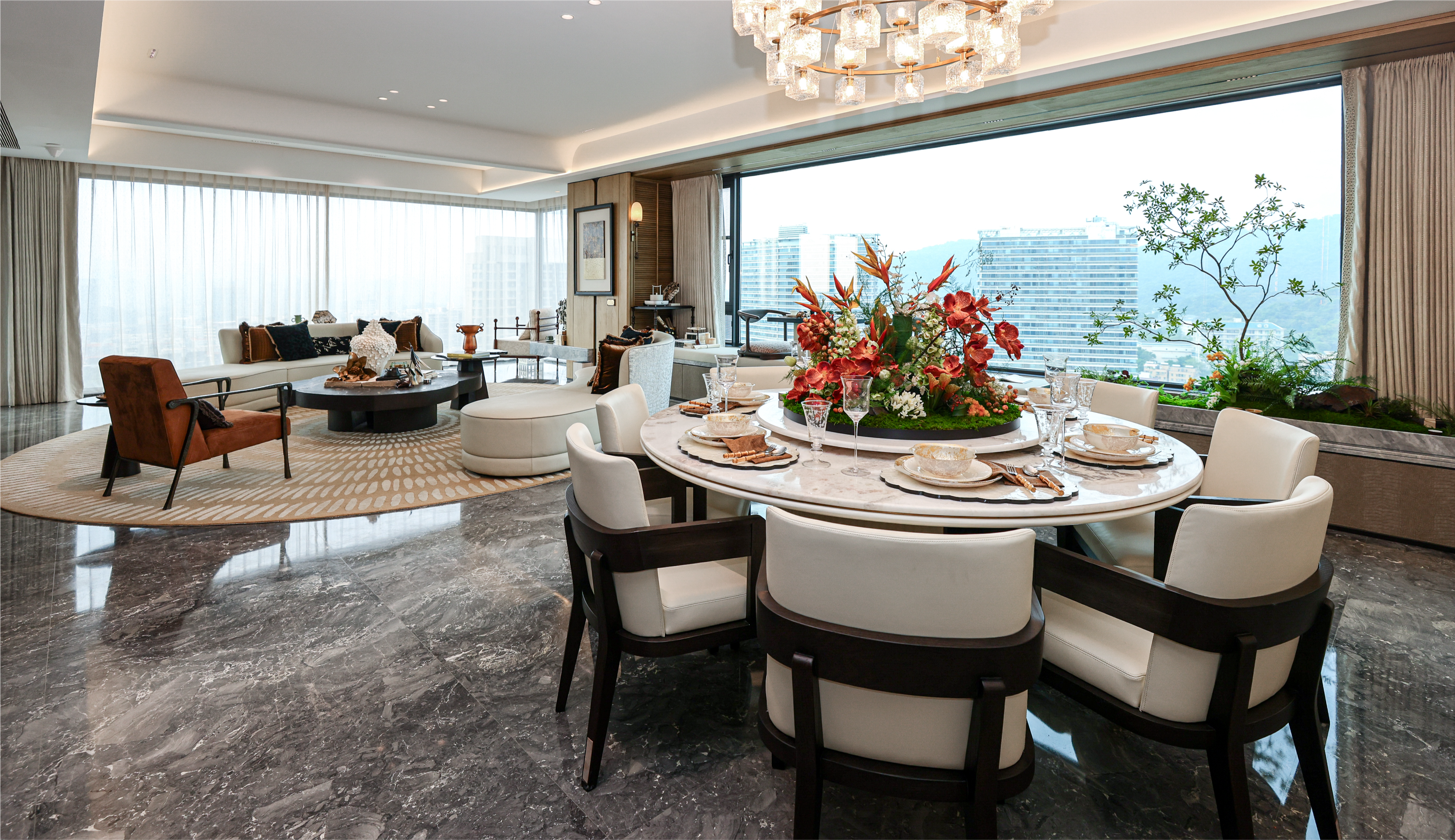 本次品鉴会核心环节是240㎡样板房的首次公开亮相。通过实景空间的沉浸式呈现,嘉宾可以直观感受到该户型的设计布局与270°的环幕视野。在参观过程中,项目营销人员还进一步向参观者介绍了该户型的设计细节、空间巧思以及板材选用等相关情况。