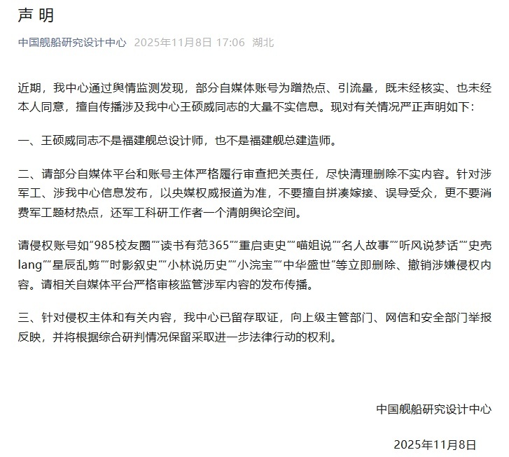 据中国舰船研究设计中心微信公众号消息,11月8日,中国舰船研究设计中心发布声明。近期,该中心通过舆情监测发现,部分自媒体账号为蹭热点、引流量,既未经核实、也未经本人同意,擅自传播涉及该中心王硕威同志的大量不实信息。现对有关情况严正声明如下:
