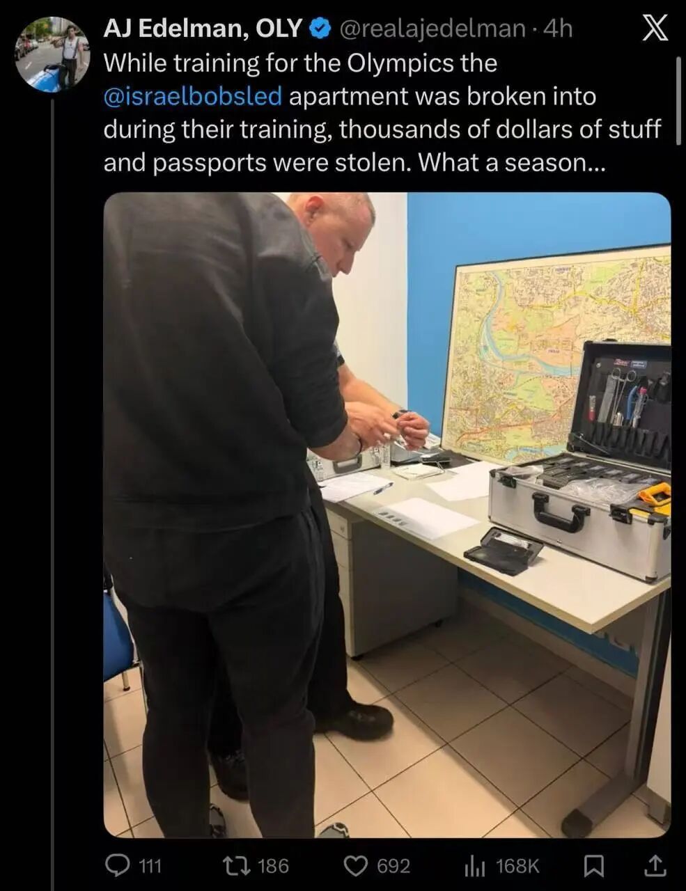我看到,以色列代表团7日已经报案了,说他们运动员在外面训练时,他们房间里的大量现金,以及很多人的护照,都被小偷一锅端了……