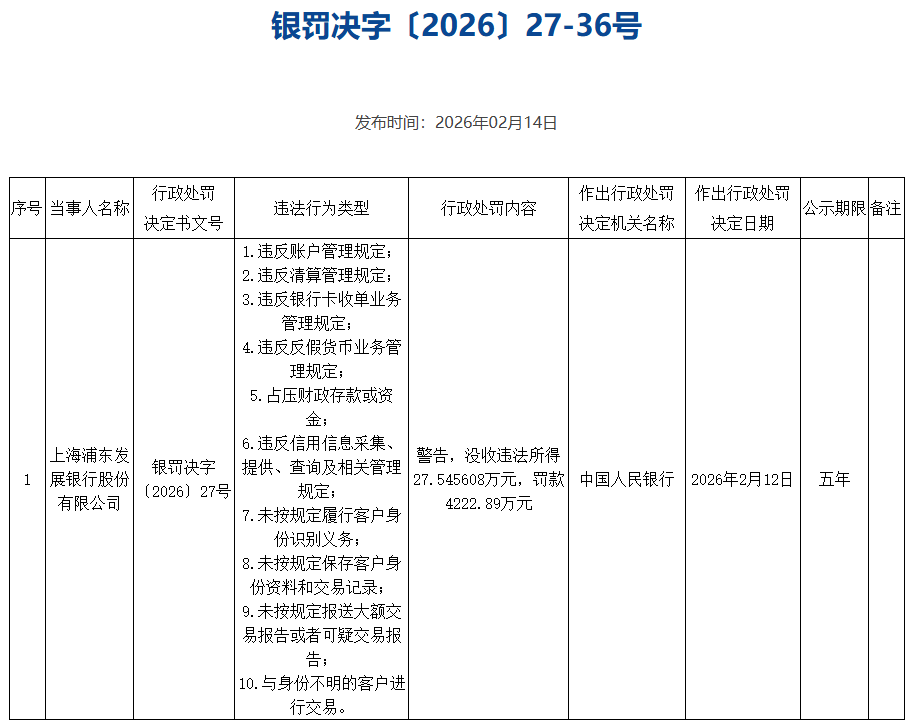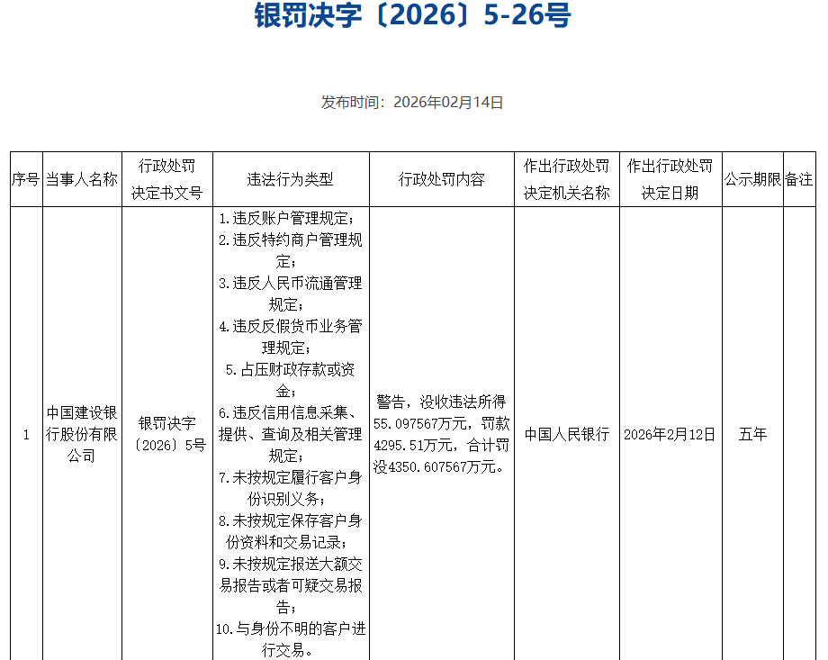 根据央行2月14日公布的行政处罚公示显示,两大国有银行中国建设银行与上海浦东发展银行同日领罚,合计被罚没金额超过8600万元。