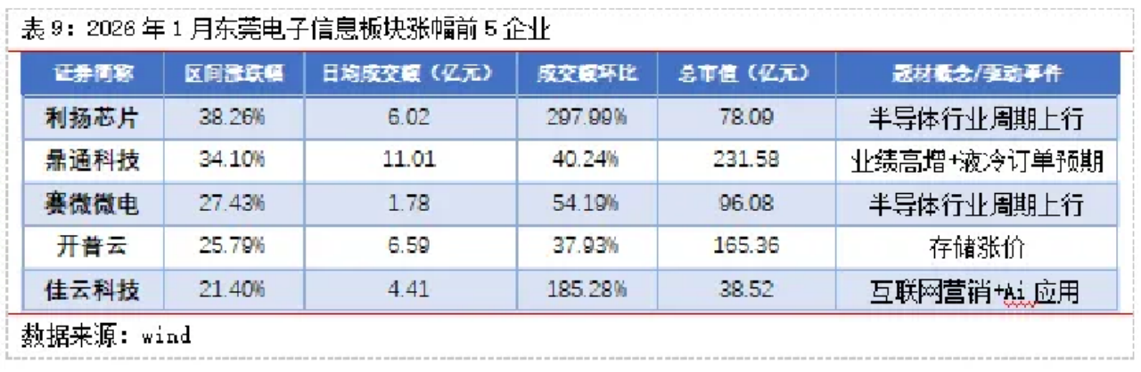 2026年1月,东莞电子信息板块涨幅区间为21.40%至38.26%,整体涨幅中枢相较于2025年12月13.32%至77.66%的分布区间上沿有所回落,但下限显著抬升,表明板块热点从单一龙头的爆发式领涨,转向更具普遍性和韧性的普涨格局,赚钱效应依然稳固但结构更为均衡。