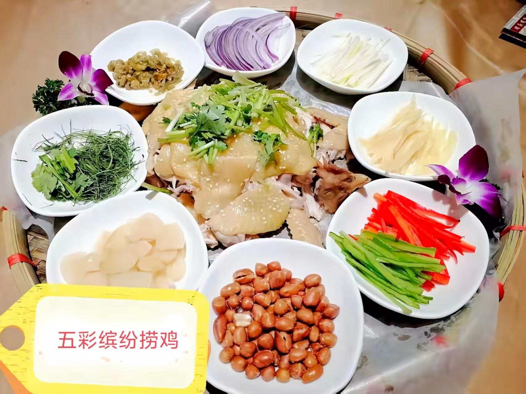 五彩缤纷捞鸡源于顺德鱼生的创意,采用180天的麻鸡,鸡质清爽、味道丰富、和味十足,寓意捞起捞起,风生水起。