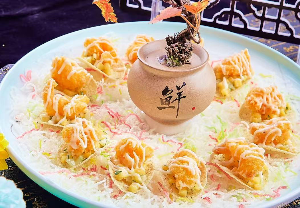 鲜芒果入菜配上沙律酱,适量薄荷叶,炸好虾球放在薯片上,口感清新爽脆。