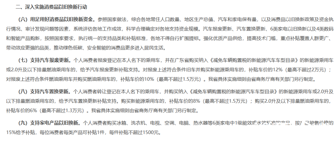 《广东省2026年大规模设备更新和消费品以旧换新工作方案》指出,消费品以旧换新方面,广东继续实施汽车报废更新和汽车置换更新补贴。