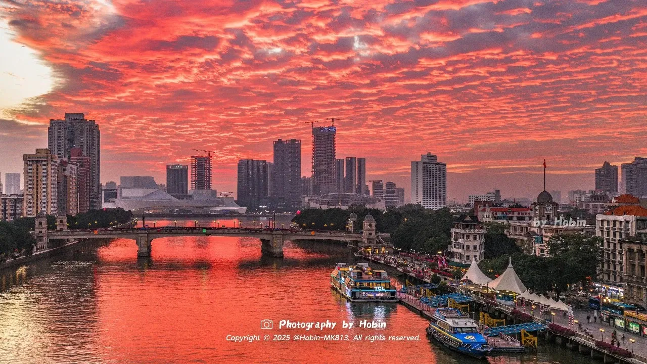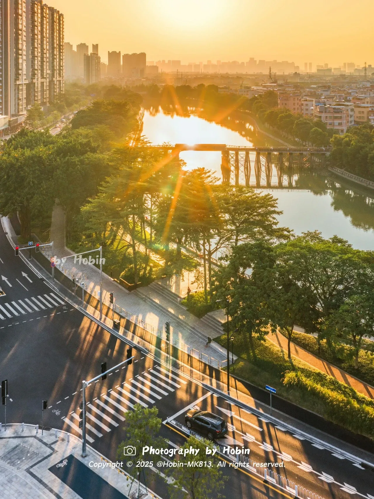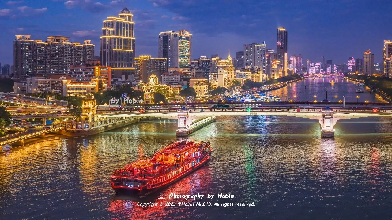 夕阳落下,江面被染成琥珀色迷人的色彩将荔湾点缀得温柔又缱绻