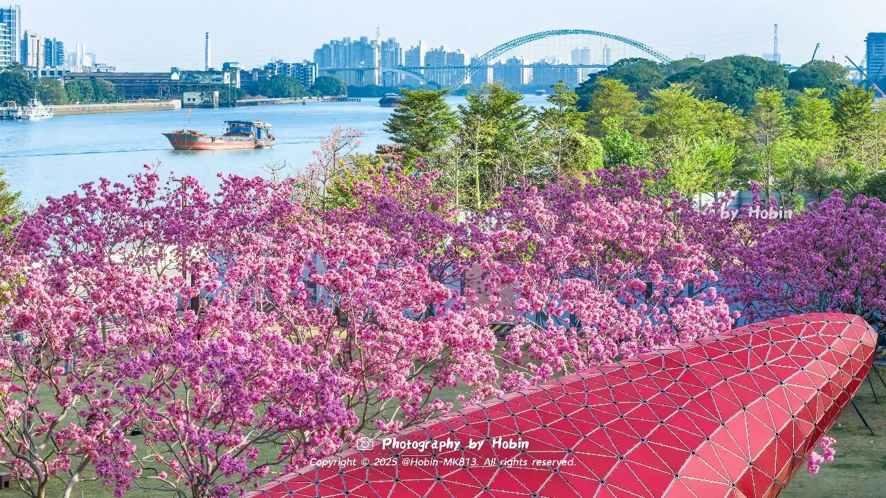 日光正好,缀满枝头的粉紫色花朵与鹤洞大桥、滨江景色交相辉映为荔湾的暖冬勾勒出最绚烂的色彩