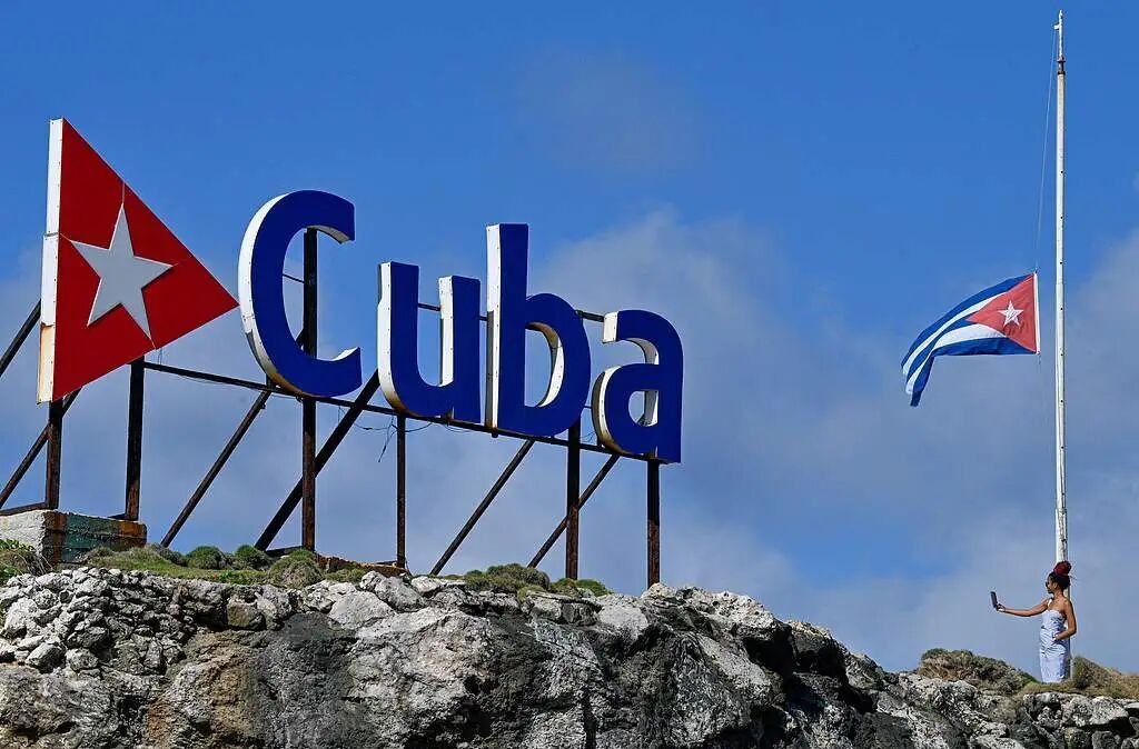 当地时间2026年1月5日,古巴哈瓦那,一名游客站在降半旗的古巴国旗旁自拍。此前,古巴宣布从1月5日起举行为期两天的全国哀悼。图/视觉中国