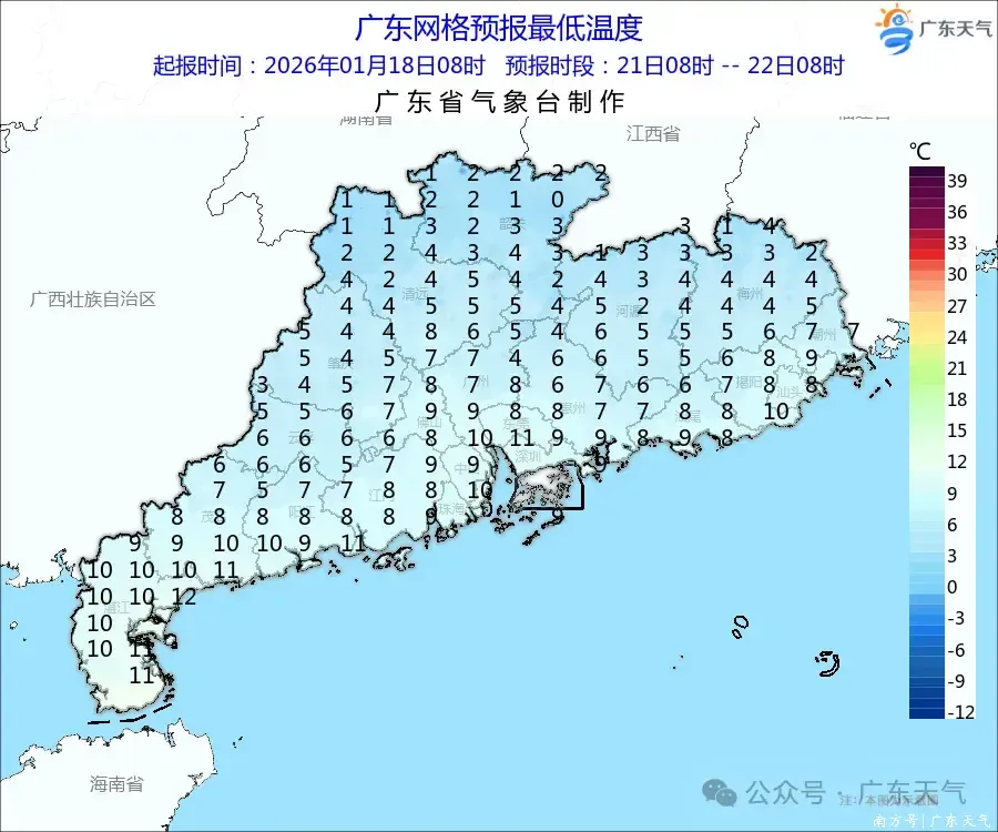 21-22日,粤北市县1~6℃,其中韶关和清远的高海拔山区-4~0℃,有冰冻,粤西市县12~16℃,其余市县7~10℃。